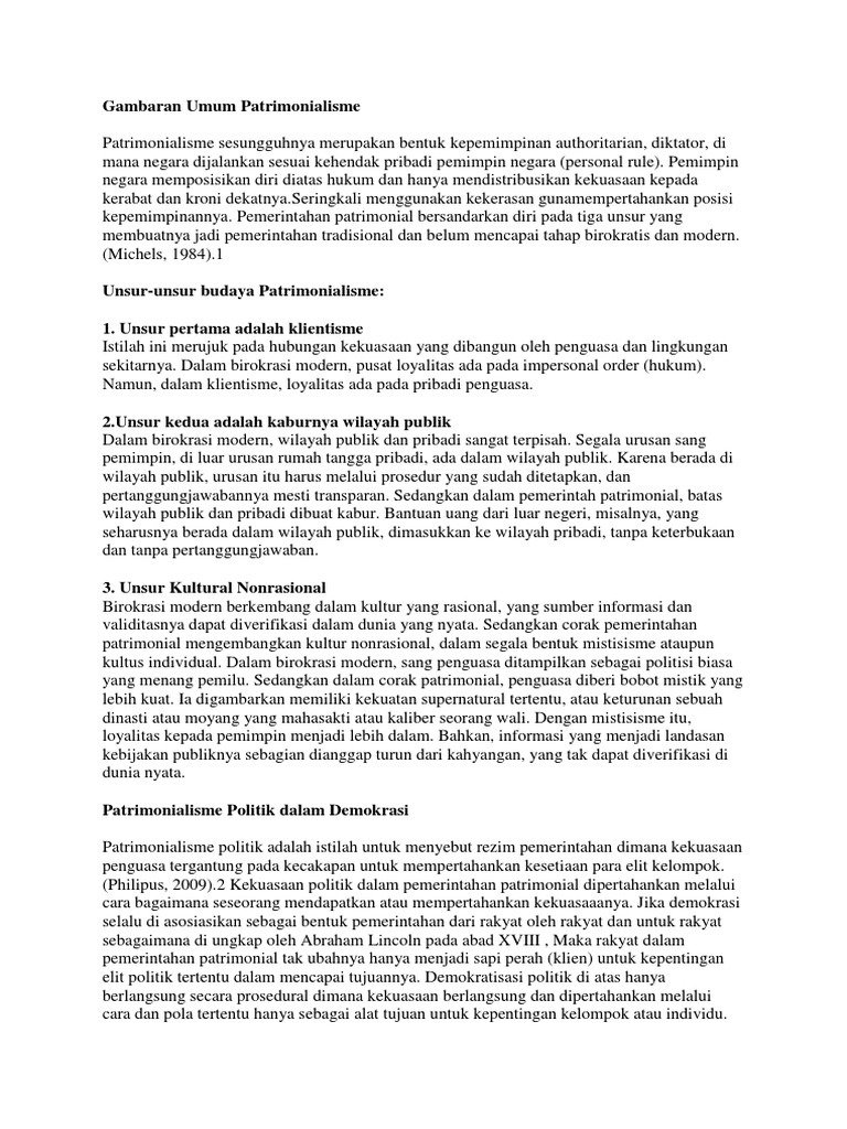 Dari sini dapat kita simpulkan bawasannya, Budaya Patrimonialisme adalah unsur yang
