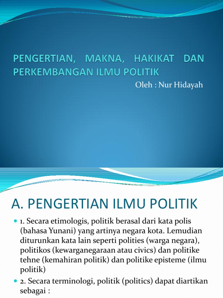 (bahasa Yunani) yang artinya negara kota. politikos (kewarganegaraan atau civics) dan politike tehne (kemahiran politik) dan politike episteme (ilmu politik) 2. PENGERTIAN ILMU POLITIK